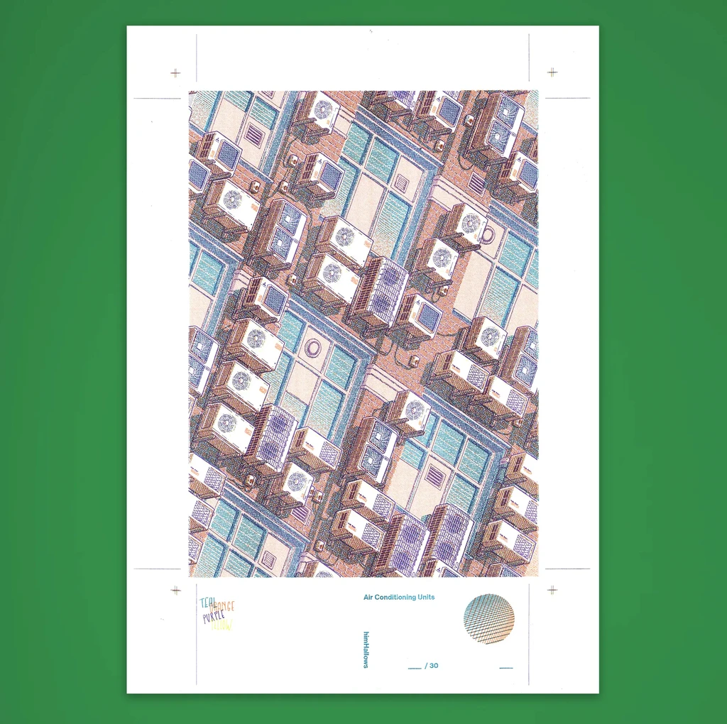 Tiled paper, risograph printed with purple, teal and yellow inks.
