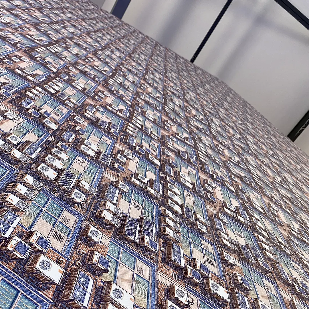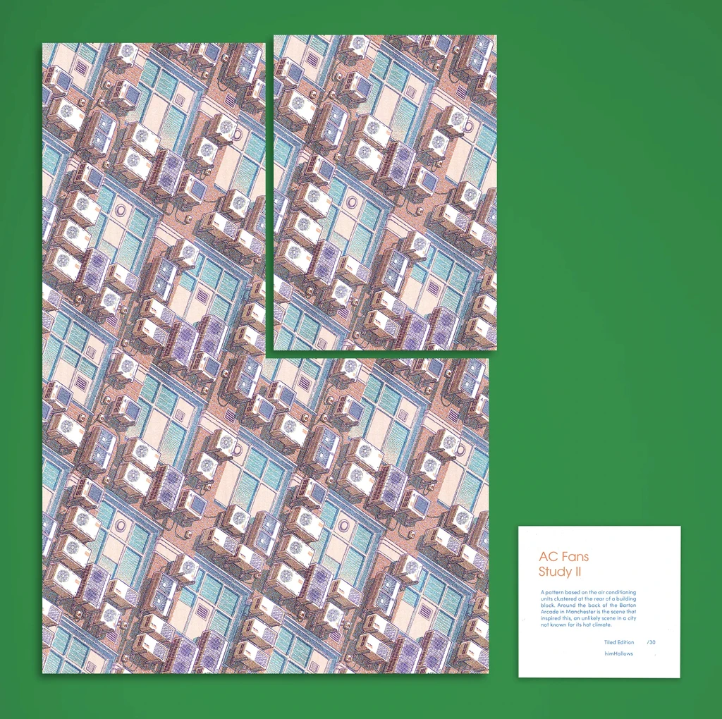 A pattern based on the air conditioning units clustered at the rear of a building block. Around the back of the Barton Arcade in Manchester is the scene that inspired this, an unlikely scene in a city not known for its hot climate.
