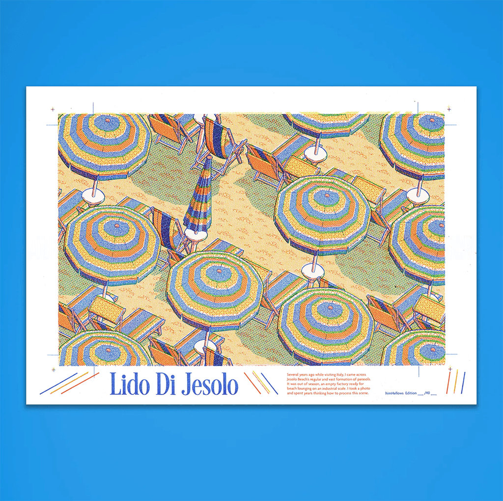 "Several years ago whilst visiting Italy, I came across Jesolo Beach’s regular and vast formation of parasols. It was out of season, an empty factory ready for beach lounging on an industrial scale. I took a photo and spent years thinking how to process this scene."