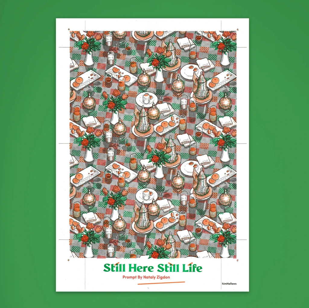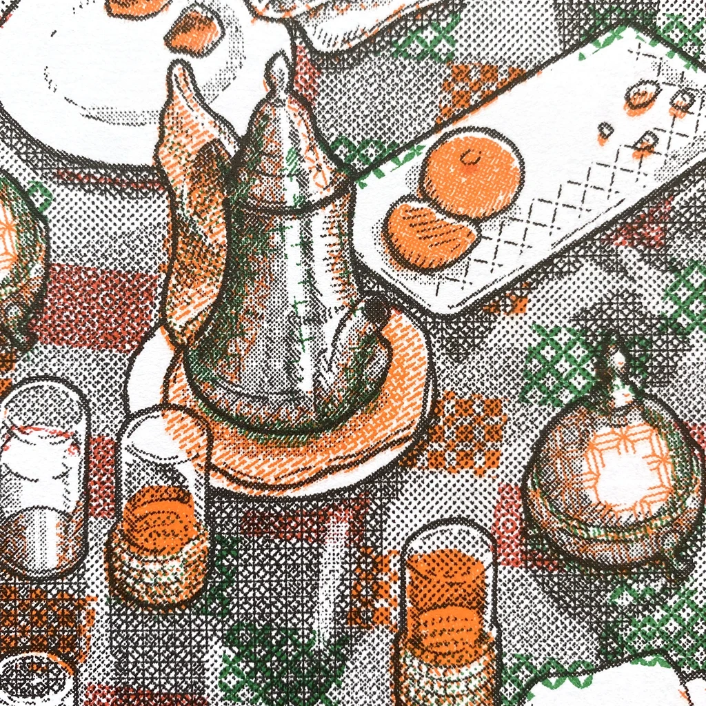 Tiled paper, risograph printed with black, green and orange inks.